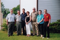A photograph including six agricultural members around a picnic table - three are sitting and three are standing. The