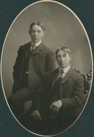 Studio portrait of two young men, George and Norman Trumbley, in suits.