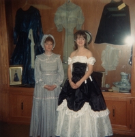 Two women dressed in mid 19th century costumes, in the Stroud Branch of Innisfil Public Library. They are participating