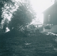 Picture of bulldozer behind a farm house digging the yard for pipe installation in Cookstown, 1962.