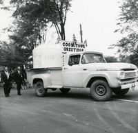 Agricultural Society parade with truck carrying a sign that reads "Cookstown Greetings". An oversized birthday cake