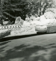 Very decorative float featuring young ladies in dresses and many flowers, advertising "Bradford The Vegetable Garden of