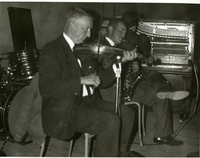 Photo of a group of musicians (from left to right: Walter Beatty, Doug Jebb, Joan Jebb) playing the fiddle, saxophone