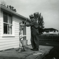 Photo of a man identified as R. Harris pumping water in front of white clapboard house.