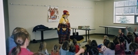 A clown entertainer at Lakeshore library branch putting on a show for a group of children, during March Break 2003. The
