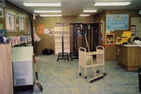 Photograph of two women stood inside the Stroud Branch of Innisfil Public Library, they can be seen standing behind a