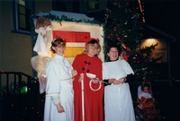 Two adults and two children, dressed as angels for the 2001 Santa Claus Parade. They are holding a sign which says