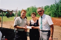 Photograph of Susan Downs receiving what seems to be a cheque from two unidentified men. Downs is central in the photo,