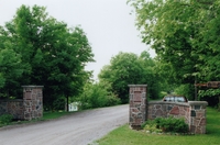 The photograph shows two brick pillar gates either side of a road leading into the Cookstown Agricultural Society
