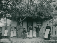 Picture showing different generations of people standing in front of an old house with picket fence. Included in the