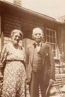 Portrait of elderly couple, Annie (née Ryan) and Robert Beaird, standing outside in front of a house