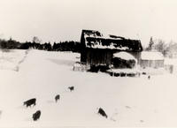Image taken in 1906 of Arthur Little's barn. There is snow on the ground, and the roof of the barn. Five cows can be, IHS707