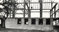 Image taken in 1935 of the barn raising of James Leonard and Annie Leonard. In the image, most of the structural beams, IHS133
