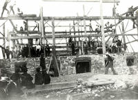 Image taken of a barn raising. In the image a group of men can be seen assembling the formational beams on top of the, IHS881
