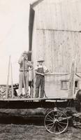 Image of an unidentified man and boy standing atop a hay wagon. This image was originally captioned as "Doug and Allan