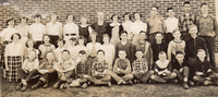 Photo of the class of 1954-55 of the Painswick School with teacher Mrs. Ina Martin. The photo was taken outside with the