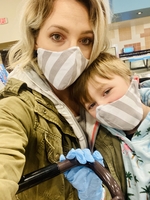 Photo of Anya Sitser with her son, Landon, wearing masks and gloves while shopping at Sobey's in Alcona on 14 May 2020.