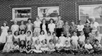 Class photo from S.S. #9 Innisfil in 1958 where Mrs. Neville Jamieson taught. Pictured from left to right, back row: , IHS1749