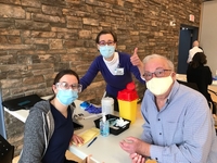 Photo of Dr. Mossman with two unidentified people preparing vaccines to distribute at a pop-up vaccination clinic held
