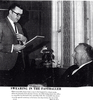 Copy of a newspaper clipping entitled "Swearing in the Fastballer" showing Blake Constable being sworn in as a