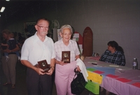Image of a man (left) identified as Riley, and woman (right) idenitfied as Mabel Jobee, holding awards for long time