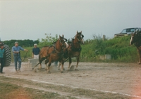 Image of two large draft horses pulling what appears to be a flat bed carrying cement blocks. The horses are in motion,