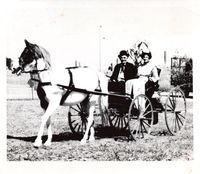 Black and white photo of a horse pulling a buggy with a man and woman in period costumes.