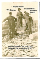 Photo of four men identified from left to right as W. Cowan, Ward Webb, unknown, and Edward Webb hewing timber for a