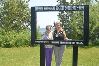 Photo of Barbara Johnston and Mayor Lynn Dollin standing inside a specially designed life-sized photo frame installed in