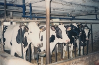 Colour photograph of a herd of Holstein cows belonging to Brian Baker, taken on 19 June 1993. The photo was taken inside