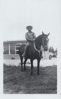 Photo of Bruce Wice on horseback, posing in front of the newly constructed Sunnybrae Public School.