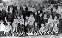 Photograph taken during a Sunday School picnic. Pictured from left to right - Back Row: James Black, unknown (x5),, IHS166