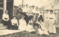 Photo of a group of ladies in Cookstown posing in front of the home of Dr. and Mrs. J.H. Miller on 34 Queen Street. The,