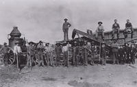 Photo of a team of men lined up alongside a steam powered thresher. This particular threshing machine had no straw, IHS3530
