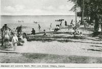 Postcard photo of the summer crowds at Glenwood and Leonard's Beaches on Lake Simcoe. A number of men, women, and, IHS 4367