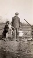 Mr. Ross and faithful collie named Bus (sic) bringing in water to the house, from the pump.,