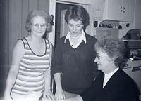 Preparing the wedding cake for serving at the open house - Alice Baker, Peggi Brown and Daureen Brown - June 1979.,