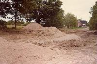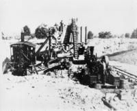 Photo of a steam powered conveyor belt being used in either a gravel pit or quarry. Two labourers are visible standing, IHS173
