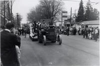 Elmer Webber with his old steam engine pulling a float. Snap taken at the main intersection of the Village. Ivan Cole in,