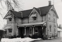 Photo of the exterior of Mr. and Mrs. Wilmot (Bill) Ferrier's home in Cookstown. It is a large two-storey house with a,