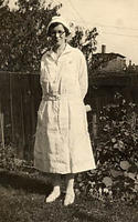 Photo of Miss Bertha Sutherland in full nursing uniform with cap, standing outdoors in front of a fence. She graduated,