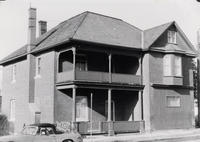 Photo of Edward Jackson standing behind his two daughters Evelyn (left) and Sandra (right), posing in front of the 100, IHS937