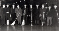 Group photo taken in 1947 of the curlers who participated in an Over 70 bonspiel in Stroud. The men are dressed in long, IHS754