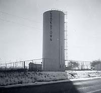 Photo of the Cookstown water tower taken on an unknown date. This landmark stands at the top of a hill just before,