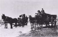 Photo of two steam power plants, one hauled by team and wagon and the other with a team and sleigh, used in this case, IHS3531