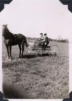 Photo of Sybil (Willoughby) and Joseph Stansfield outdooors in front of a treed background. Sybil is weraing a skirt,, IHS 4471