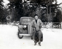 Photograph of Morris John Warnica (1918-1978) taken after a day of raccoon hunting. He is pictured standing holding