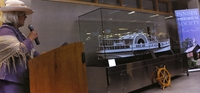 Photo of Donna Wice, president of the Innisfil Historical Society, giving a presentation during the unveiling of a model, IHS 4504